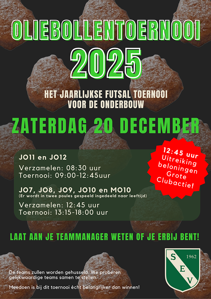 Ook dit jaar vindt het jaarlijkse Oliebollentoernooi weer plaats. Dit is het futsal-toernooi voor onze pupillen richting het einde van het jaar. De eerste zaterdag van de kerstvakantie gaan ze onderling het gevecht aan.