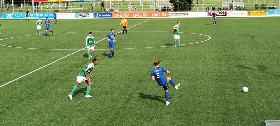 Goed voetbalweer, volle tribune en veel publiek in het zonnetje aan de lange zijde van het hoofdveld. Hoewel het nog heel vroeg in het seizoen is, worden de bezoekers toch al gezien als kanshebber voor een hoge eindnotering. Oegstgeest begon dan ook sterk aan de wedstrijd. Met verzorgd voetbal werd een licht veldoverwicht gebouwd. SEV wist daar wel raad mee. Sterker. Er werd geen kans weggegeven en in de 14e minuut is het Rashid Haynes die de eerste grote kans van de groen/witten krijgt. Net over. Nog geen vijf minuten later grote wanorde in de Oegstgeester defensie en Haynes probeerde het vanaf 25 meter. Zijn fraaie lob eindigde op de lat. Inmiddels werd door de weergoden het zonnetje ingeruild voor een hevige bui. SEV nam steeds meer het initiatief en in de 29e minuut werd een Oegstgeester handsbal bestraft door de prima leidende scheidsrechter Wagner. Jasper Koning ontfermde zich over de bal en zijn inzet landde buiten bereik van doelman Wijsman op de lat. Hoe je met kansen omgaat toonden de bezoekers niet veel later. De allereerste mogelijkheid werd Thijs de Roy van Zuydewijn direct tot voorsprong gepromoveerd. Nog voor rust kreeg SEV nog twee grote kansen om de stand gelijk te trekken maar de thee werd toch met 0 – 1 opgezocht. Na rust min of meer hetzelfde spelbeeld. FC Oegstgeest veel aan de bal en een hardwerkend SEV dat met strijd op zoek ging naar de gelijkmaker. In de slotfase werd het harde werken van de thuisploeg beloond. De net ingebrachte Fares Daouadi bracht SEV naast de bezoekers. Zo eindigde dit aantrekkelijke duel in een terecht gelijkspel.
